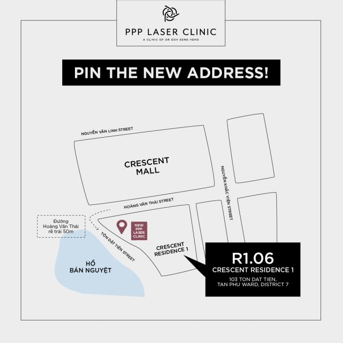 | Để đảm bảo quy trình làm đẹp một cách an toàn, PPP Clinic Quận 7 sẽ hoạt động dưới mô hình boutique clinic có vị trí mặt tiền nổi bật đối diện Hồ Bán Nguyệt tại R1.06, Crescent Residence 1 – 103 Tôn Dật Tiên, Phường Tân Phú, Quận 7 và sẽ tạm thời mở cửa từ 10:00 đến 20:00 hàng ngày cho đến khi có thông báo mới. |