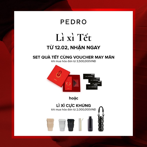 Hơn thế nữa, khi mua hóa đơn từ 3.500.000 đồng bạn sẽ được nhận ngay set quà Tết phiên bản giới hạn của PEDRO bao gồm 1 card holder thời trang và 1 bao lì xì cực khủng với các voucher có giá trị ngẫu nhiên: 100K, 200K, 500K và 1 triệu đồng. PEDRO hứa hẹn sẽ thu hút nhiều khách hàng đến tham quan và mua sắm cho bản thân cũng như những món quà yêu thương dành cho bạn bè, người thân hay người yêu trong dịp lễ này.