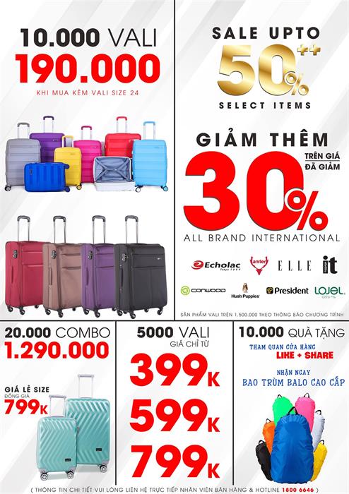 + Chương trình giảm giá sốc: giảm thêm 30% trên giá đã giảm (30-50%) áp dụng cho tất cả các vali thương hiệu quốc tế có mặt tại hệ thống cửa hàng của Lug.vn/Travel Store (Vincom/ Lotte/Aeon/Bitexco).