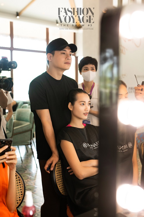 Giám đốc Sáng tạo – Chuyên gia Trang điểm Nam Trung kiểm tra làn da của người mẫu trước khi make-up bên trong hậu trường Fashion Voyage #3.
