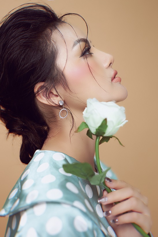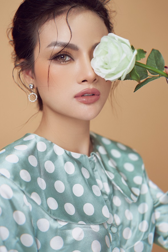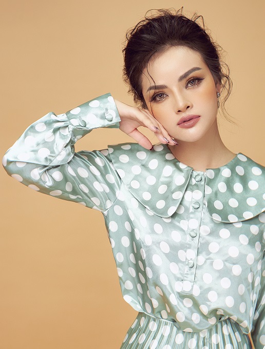 Bộ ảnh mới với phong cách nữ tính, dịu dàng này của Cát Tiên được đông đảo khán giả yêu thích. Lựa chọn bộ đầm với hoạ tiết chấm bi giúp cô nàng trở nên nữ tính, dịu dàng hơn. Với phong cách trang điểm ấn tượng, điểm nhấn tóc búi xõa lả lơi cùng thần thái “đỉnh cao”
