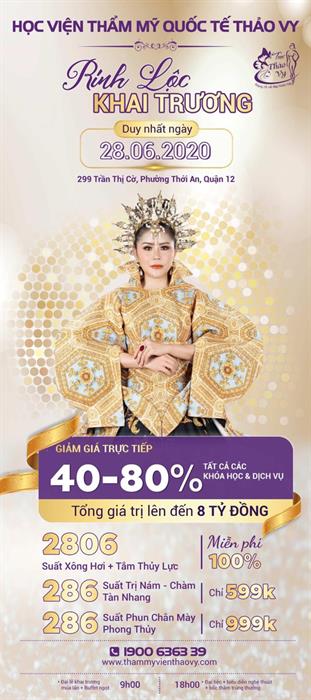 Tintuc - Nhân dịp khai trương cơ sở mới tại địa chỉ 299 Trần Thị Cờ, Phường Thới An, Quận 12, TPHCM, Học viện Thẩm mỹ Quốc tế Thảo Vy đưa ra chương trình ưu đãi đặc biệt, giảm giá 40% - 80% tất cả dịch vụ làm đẹp bằng công nghệ cao.