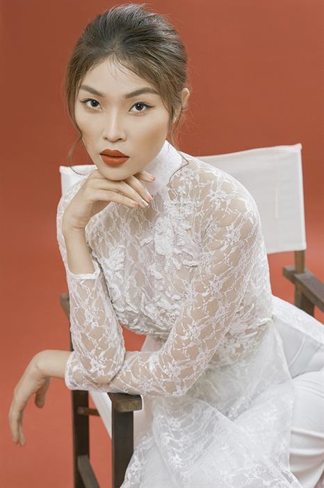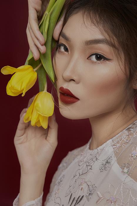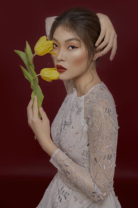 Với lối tạo hình nhẹ nhàng, Á Đông, kết hợp cùng trang phục áo dài trắng truyền thống chất ren cách điệu cùng hoa tulip tạo nên sự tinh khôi, thanh tao.