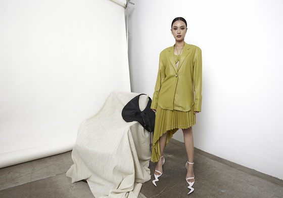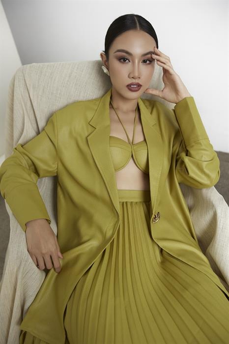 Với bộ trang phục màu xanh chuối lạ mắt, Á hậu Thủy Tiên vô cùng cá tính khi kết hợp blazer và chân váy xếp ly. Trong set đồ màu sắc nổi bật này, Thủy Tiên diện những phụ kiện tối giản, giúp bộ trang phục không rối mắt và trở nên hài hòa. Điểm nhấn táo bạo nhất của tổng thể bộ trang phục này chính là đôi giày cao gót có thiết kế độc đáo. Nàng Á hậu tạo ra sự bất ngờ lớn cho khán giả với sự phong cách đa dạng của cô ấy.