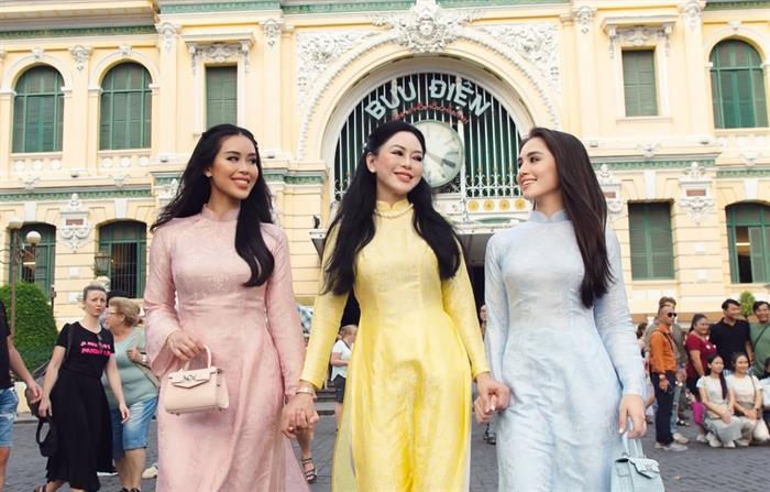 Bà tự tin sải bước vô cùng nổi bật bên cạnh các cô con gái trẻ đẹp mà vẫn vô cùng rạng rỡ. Chiếc áo dài nền nã, phối kèm giày cao gót màu nude đồng điệu và đẹp mắt. Bên cạnh đó, bà cũng phối cùng trang sức ngọc trai sang trọng và đẳng cấp.