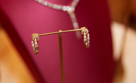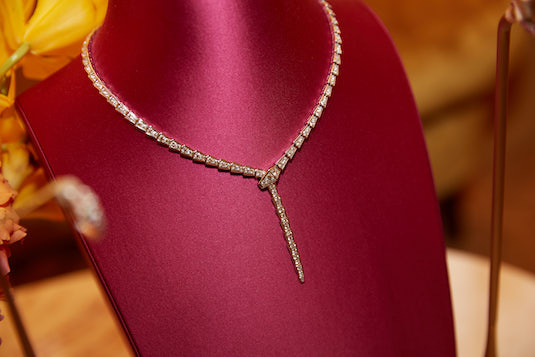 Vòng cổ và bông tai hình rắn Serpenti đính full kim cương cũng là những món nữ trang đặc trưng của Bvlgari được Minh Hằng chọn đeo trong màn biểu diễn trên sân khấu tiết mục first dance. Đây là bộ trang sức đỉnh cao về nghề kim hoàn của Ý với kỹ thuật chạm khắc thủ công từng hạt kim cương tự nhiên trên mỗi lớp vảy rắn, tạo ra sự uyển chuyển và linh động theo bừng nhảy của cô dâu. Bộ trang sức mang ý nghĩa của sự tái sinh, sự quyến rũ và nữ quyền – cũng giống như vẻ đẹp và nét cá tính mà chú rể vốn bị thu hút từ cái nhìn đâu tiên bởi cô dâu của mình.