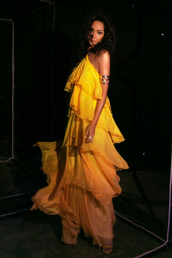 Bộ đầm được thiết kế với chất liệu mỏng, nhẹ, cùng kiểu dáng xếp tầng, buông xõa xuống. Sở hữu vóc dáng nóng bỏng nhưng H’Hen Niê đã “giấu dáng” khi diện bộ đầm này, vì cô muốn tập trung vào sự thoải mái khi di chuyển, thay vì khoe hình thể. Bên cạnh đó, trang phục rất phù hợp với kiểu tóc xoăn hoang dã, mang phong cách tropical đầy ấn tượng.