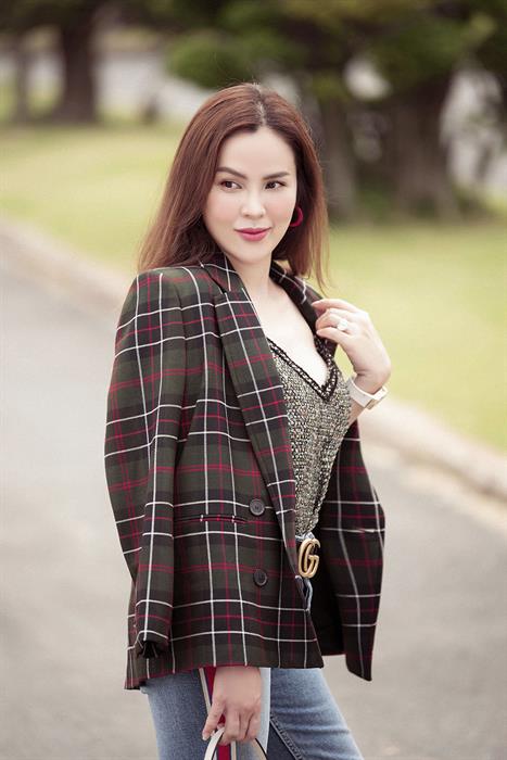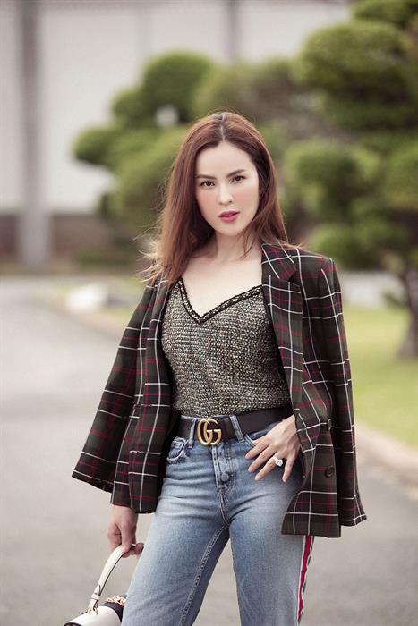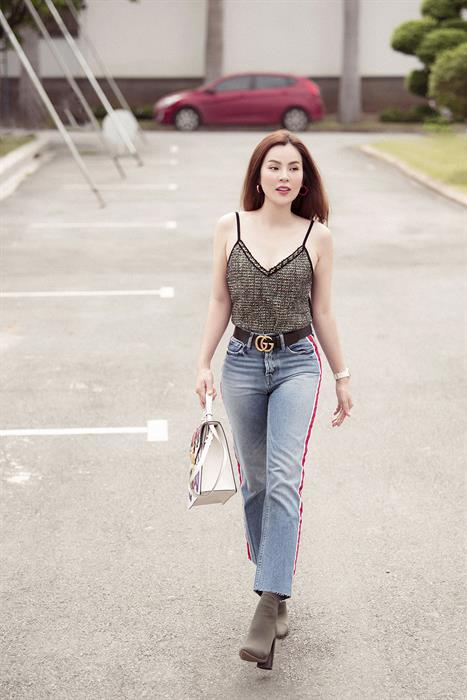 Với set đồ đầu tiên, mỹ nhân gốc Trà Vinh kết hợp áo hai dây với quần jeans, đi cùng là blazer mix cùng túi hiệu Gucci.