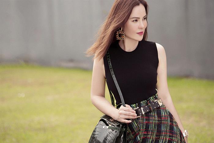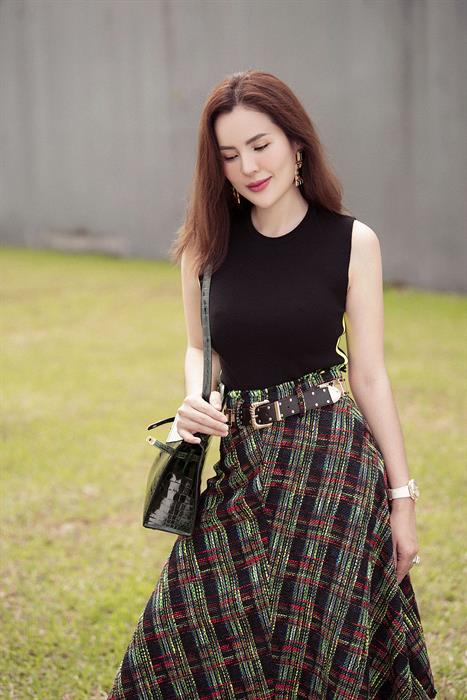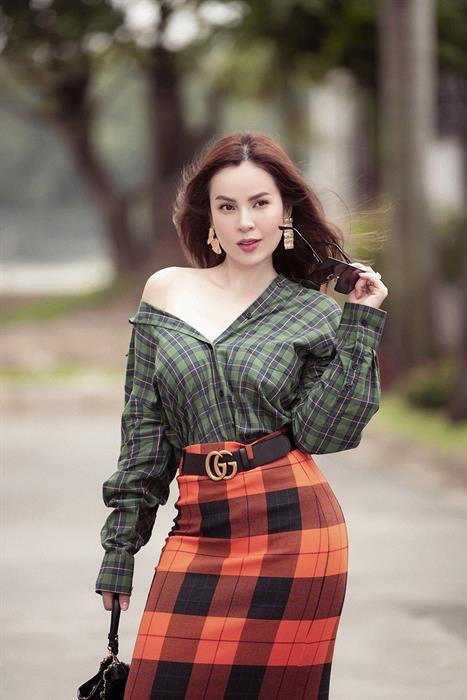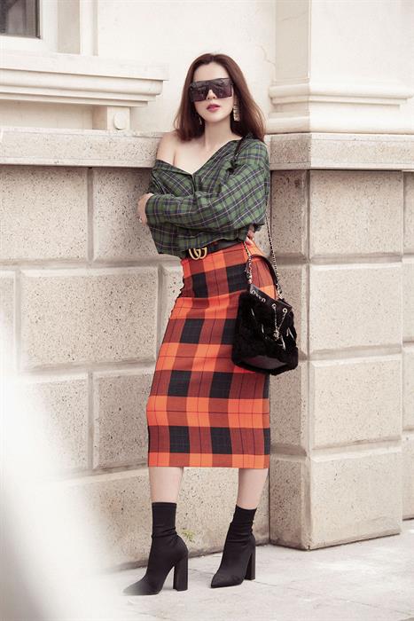 Phương Lê đã biến chiếc ao sơmi bình thường trở thành chiếc áo trể nải kết hợp với chiếc váy cam carô mix cùng chiếc túi Chanel.