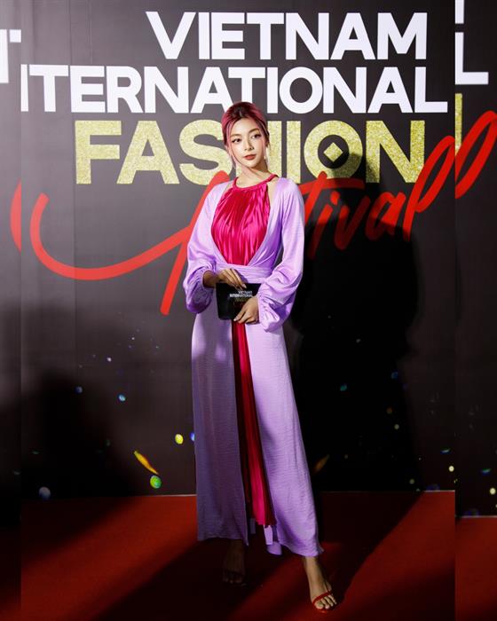 Một điểm cộng thật sự lớn cho Katleen ở show diễn của NTK Adrian Anh Tuấn nằm trong khuôn khổ sự kiện đình đám Vietnam International Fashion 2020 chính là cách cô “chơi màu”. Thường những gam màu quá trội, gắt mắt có nguy cơ khiến người diện trở thành “thảm họa thời trang”. Tuy nhiên, với Katleen điều này lại rất bất khả thi khi cô mạnh dạn phối bộ váy cổ yếm gam hồng neon, xếp li tỉ mỉ với item áo tứ thân tím lilac được thiết kế bo tay phồng đầy mới lạ. Với tổng thể quá đỗi nổi bật này, mỹ nhân chỉ chọn độc 1 phụ kiện là đôi high heels sắc đỏ kiểu dáng tối giản.