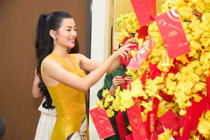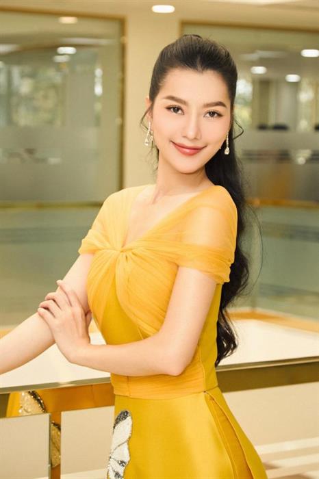 Á hậu Hoàng Nhung chọn chiếc đầm vàng, có sự pha trộn giữa nét cổ điển và hiện đại. Cô khoe trọn nét đẹp thanh tân và tràn đầy năng lượng khi có dịp hội ngộ cùng “hội chị em” nhà Hoàn vũ Việt Nam.