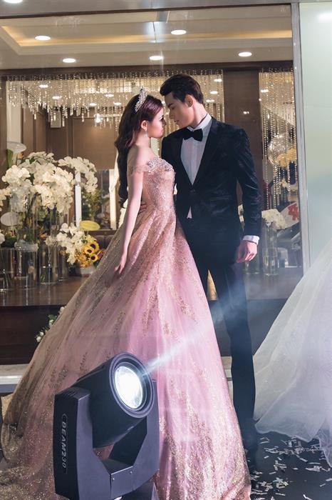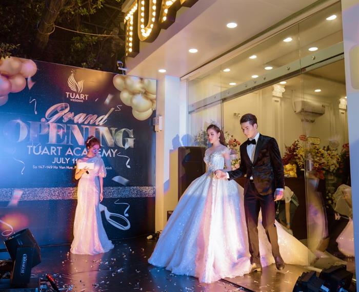 Tintuc - Sau khi xuất hiện với 5 bộ váy lộng lẫy tại tiệc cảm ơn, Á Hậu Thư Dung tiếp tục hoạt động của mình với vai trò Vedette kết show cùng Quán quân Người mẫu thời trang Việt Nam Nguyễn Sỹ Hưng trong ngày khai trương chính nhánh thương hiệu áo cưới TuArt Wedding.