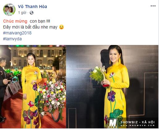 Ngoài ra, tại sự kiện này, cặp đôi cũng đã được dịp hội ngộ cùng Lâm Vỹ Dạ. Vốn là bạn thân trong giới showbiz, Võ Thanh Hòa không khỏi vui mừng khi Lâm Vỹ Dạ đoạt giải “Diễn viên Hài được yêu thích nhất” tại Mai vàng 2018. Không chỉ rạng rỡ tạo dáng trên thảm đỏ, nam đạo diễn còn chia sẻ niềm vui này cùng với cô bạn thân trên trang facebook cá nhân.