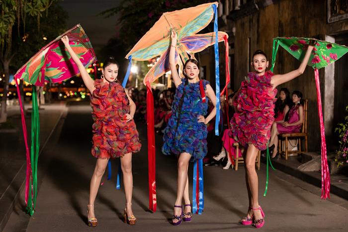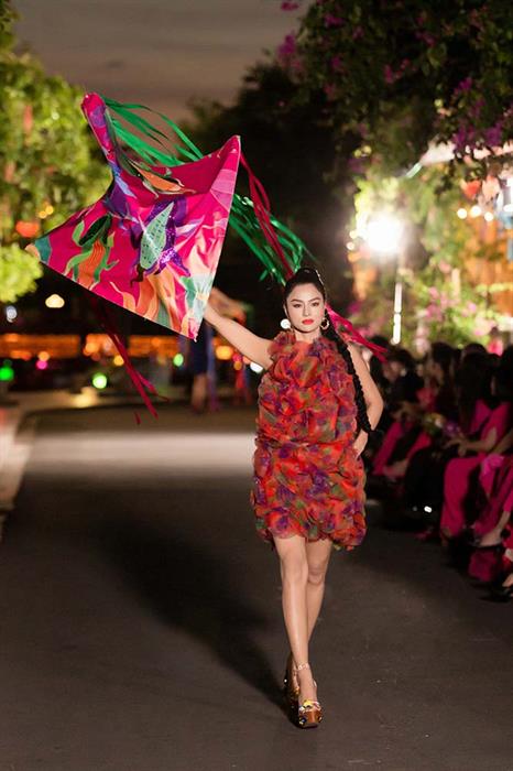 Chính thức trình diễn BST, chiều tối ngày 4/6, Vũ Thu Phương xuất hiện với chiếc đầm hồng nổi bật, bím tóc thắt dài, hóa thân thành nàng thơ hòa vào không khí yên bình nơi phố cổ. Siêu mẫu có màn catwalk ấn tượng với cánh diều - một biểu tượng dung dị, êm đềm của tuổi thơ. Bên cạnh đó, cô còn thể hiện những bước catwalk đầy quyền lực sau đó. Hoà mình vào không gian Hội An hoài cổ, mỹ nhân đã góp phần truyền tải đầy đủ tinh thần vui sống ‘joie de vie’ của 2 nhà thiết kế.