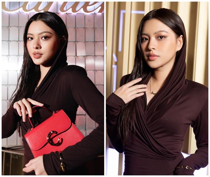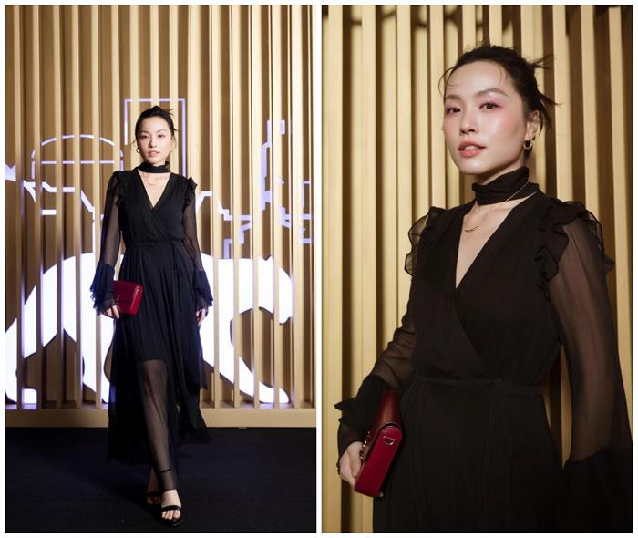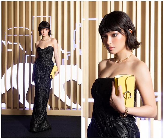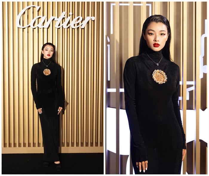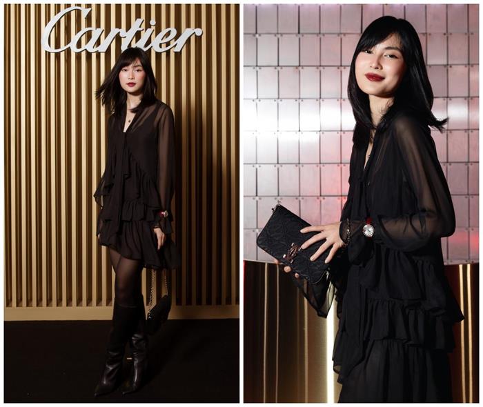 Cũng với bộ váy đen quyền lực, Quán quân The Face 2017 Tú Hảo khoe vẻ đẹp ngọt ngào với bộ trang sức, kết hợp mẫu mini bag màu đỏ rực cháy của dòng Pathère De Cartier với tổng trị giá hơn 1 tỷ đồng và layout makeup tông nude đầy quyến rũ.