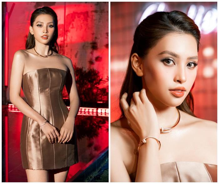 Hoa hậu Tiểu cũng là một trong những mỹ nhân nổi bật góp mặt tại buổi gặp gỡ. Hoa hậu Việt Nam 2018 tạo sự khác biệt với outfit tông màu gold rose, chất liệu váy bắt sáng cộng hưởng cùng bộ trang sức đình đám Juste Un Clou.