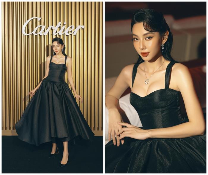 Hoa hậu Thùy Tiên gây ấn tượng mạnh mẽ ngay cái nhìn đầu tiên với phong cách all black gồm bộ đầm xòe bay bổng, chiết eo khoe đường cong nóng bỏng kết hợp cùng layout trang điểm cổ điển nhưng sắc sảo và điểm nhấn là bộ trang sức cao cấp đến từ thương hiệu Cartier.