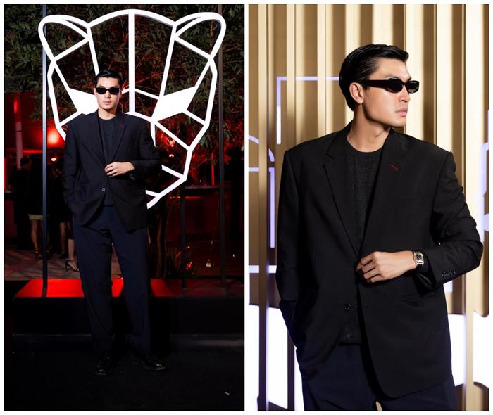 Nam người mẫu, travel blogger Quang Đại diện bộ suite đen kèm cặp mắt kính cá tính và đồng hồ Cartier Santos-Dumont sang trọng.