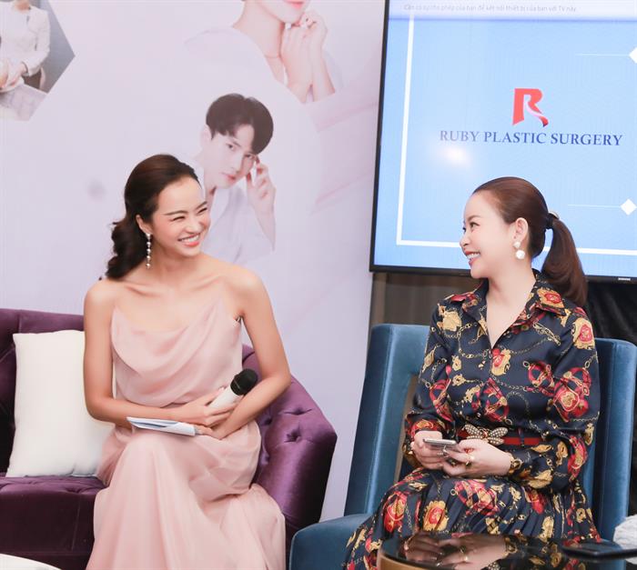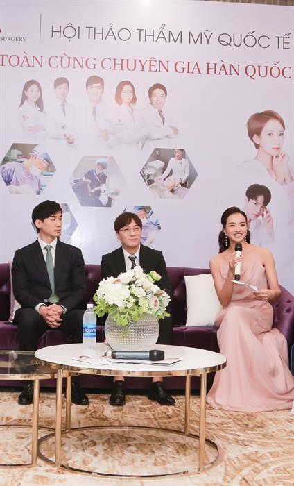 Hoa hậu/doanh nhân Hải Dương và MC Phan Anh tham gia giải đáp thắc mắc cho khách hàng trong buổi hội thảo thẩm mỹ quốc tế với chuyên gia Hàn Quốc.