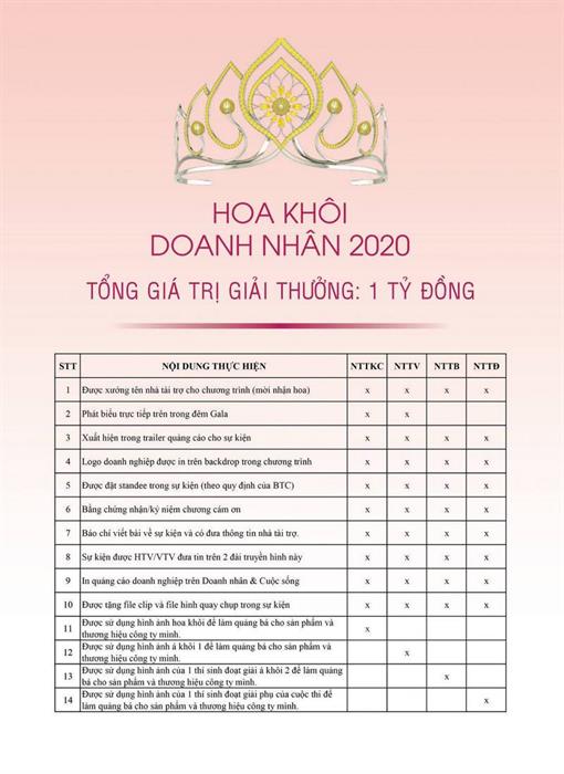 Cuộc thi Hoa khôi Doanh nhân Việt Nam 2020 do Công ty Truyền thông Giải trí Bến Thành tổ chức. Thông qua cuộc thi lần này, các thí sinh sẽ có cơ hội tham gia vào một sân chơi bổ ích, lý thú và lành mạnh dành cho các quý cô đang làm quản lý doanh nghiệp hoạt động trên toàn thế giới. Chương trình cũng được kỳ vọng sẽ góp phần làm phong phú, đa dạng thêm các hoạt động văn hóa dành cho Doanh nhân.