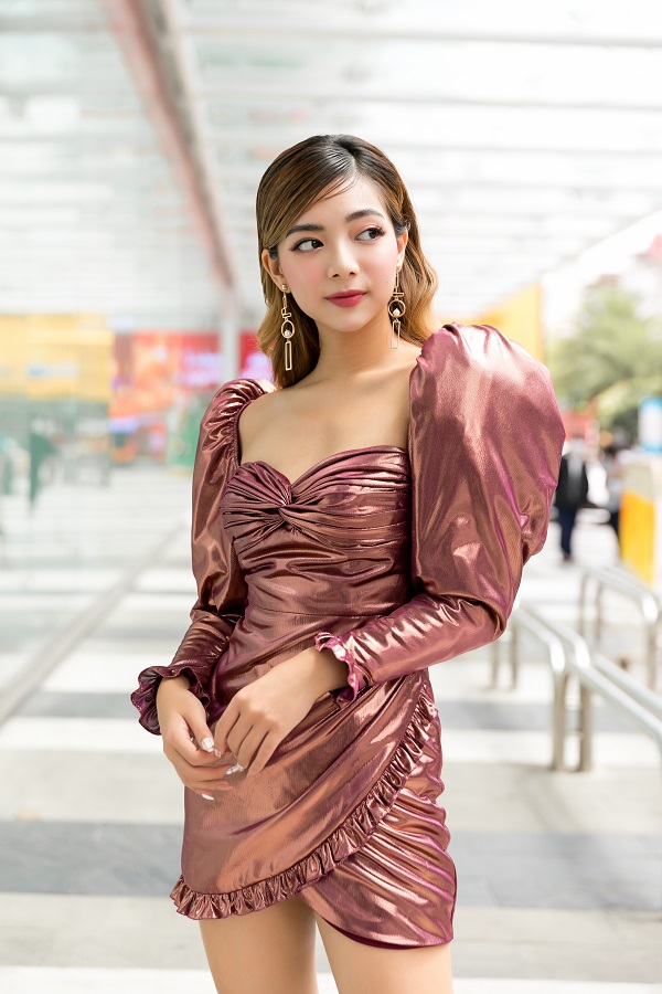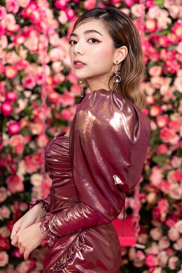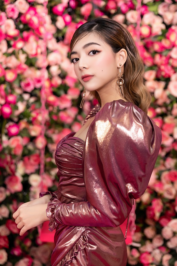 Nữ diễn viên diện váy hồng với chất liệu nhũ ánh kim cùng phần thiệt kế cổ vuông tay phồng tạo phom dáng đối xứng. Đi kèm với trang phục, Katleen cũng chọn tông trang điểm nền nã. Sự chăm chút từ kiểu tóc đến việc kết hợp các phụ kiện hoa tay, giày không quá cầu kỳ cho thấy người đẹp luôn đầu tư hình ảnh nhưng luôn giữ sự tiết chế trong mỗi lần xuất hiện của mình.