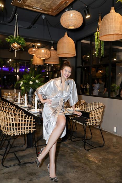 Hoạt động hơn 10 năm trong làng giái trí, có thể nói đây là một trong những dự án kinh doanh ẩm thực được chân dài họ Phạm ấp ủ từ rất lâu. Trong buổi khai trương, cô xuất hiện với phong cách trẻ trung.