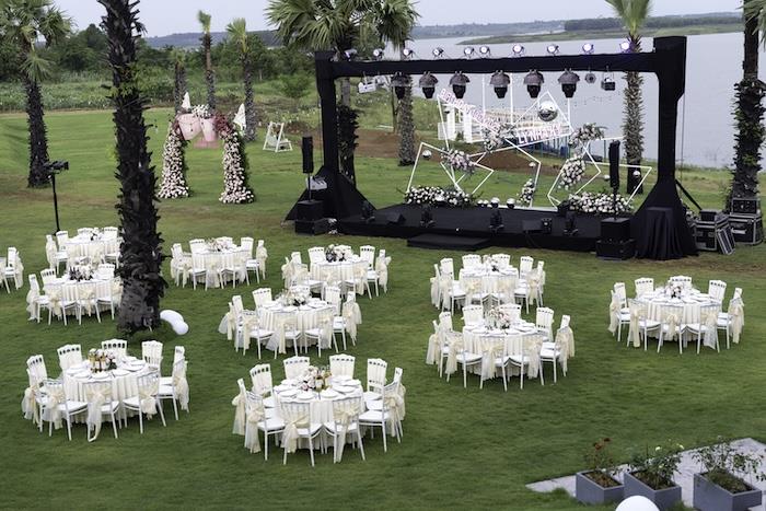 Điều khiến mọi khách mời choáng ngợp ngay từ cái nhìn đầu tiên chính là màn trình diễn ánh sáng ngoạn mục. 5 triệu cái bóng đèn đã được thắp sáng rực rỡ khắp khuôn viên, tạo nên một khung cảnh lung linh huyền ảo đến khó tin. Toàn bộ không gian được trang hoàng như một bữa tiệc công chúa thực thụ, với sự đầu tư không tiếc tay vào hoa tươi. Hàng trăm triệu đồng tiền hoa tươi được nhập khẩu, đặc biệt là hàng triệu bông hồng Pháp, được đội ngũ trên dưới 30 thợ cắm hoa chuyên nghiệp tỉ mỉ dàn dựng, biến mỗi góc nhìn thành một tác phẩm nghệ thuật. Sự chỉnh chu và tinh tế được thể hiện đến từng chi tiết nhỏ nhất: từ những chiếc nơ trên ghế, những chiếc khăn trải bàn sang trọng, cho đến từng chiếc menu cao cấp, tất cả đều được đặt may và thiết kế riêng, toát lên vẻ độc quyền và đẳng cấp thượng lưu không thể trộn lẫn.