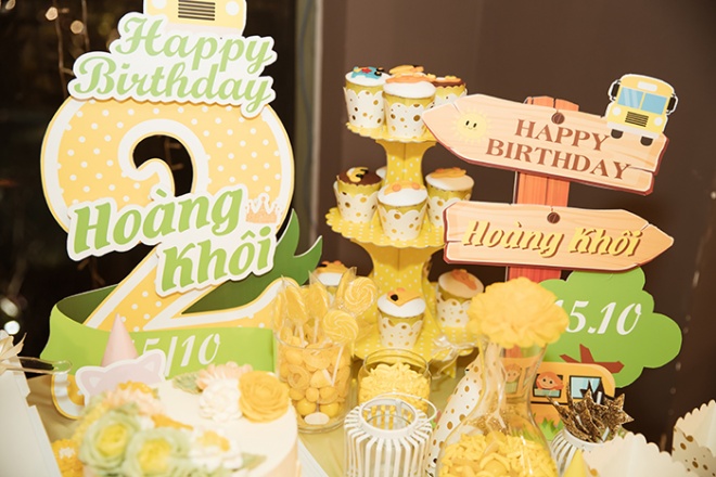 Buổi tiệc lấy tông vàng-trắng làm chủ đạo. Bé Will thích chơi xe hơi nên Dương Cẩm Lynh nảy ý tưởng trang trí không khí buổi tiệc bằng hình ảnh xe hơi ngộ nghĩnh từ backroup đến các chiếc bánh hình ô tô. Diễn viên cho biết nhìn con trai ngày càng khôn lớn cô càng có động lực làm việc để nuôi dưỡng bé ngày một trưởng thành.
