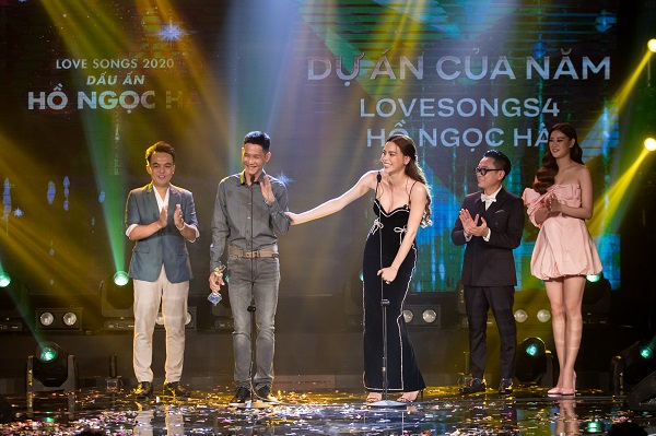 Bên cạnh đó, giải thưởng đặc biệt Dự án của năm còn bất ngờ gọi tên và trao tặng cho dự án Love Songs 2020 của Hồ Ngọc Hà. Cùng với nhạc sĩ Hoài Sa và đại diện Ekip nhận giải thưởng, Hồ Ngọc Hà chia sẻ: