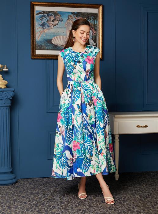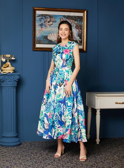 Đầu tiên, phải kể đến chất liệu được hãng sử dụng trong thiết kế này. Vải TAPTA được mệnh danh là chất liệu tuyệt vời dành cho những chiếc váy thời thượng. Nhờ đặc tính giữ phom dáng tốt, bề mặt bóng bẩy, làm nổi bật từng họa tiết theo đúng ý đồ của các nhà thiết kế. Điển hình là chiếc đầm mang họa tiết hoa lá kết hợp với sắc xanh rất "thiên nhiên", tạo cảm giác mát lành giữa mùa hè nóng bỏng. Chi tiết chiết eo cùng độ xếp ly của váy cũng là điều gây thích thú cho người xem.