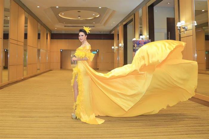Tại đêm bán kết, người đẹp diện trang phục dạ hội màu vàng của NTK Oanh Phan, lấy cảm hứng từ những loài hoa. Thiết kế có phần eo đính đá giúp tăng lên sự sang trọng và quý phái của cô.