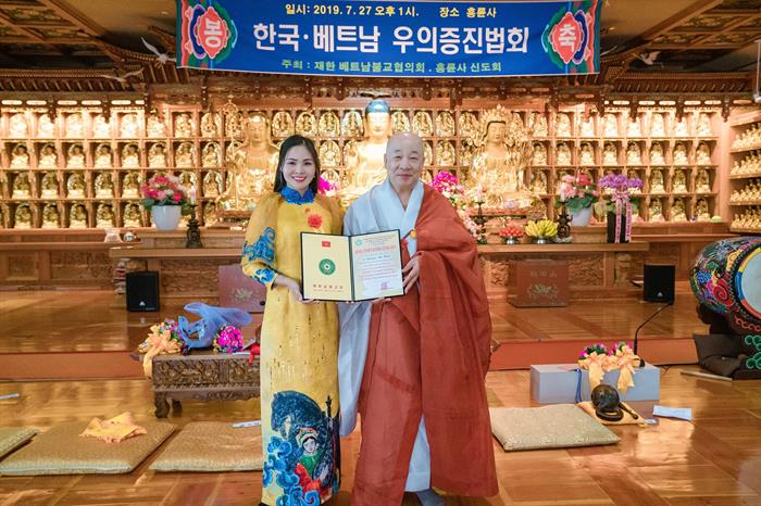 Tintuc - Mới đây, Hoa hậu Nguyễn Thị Thùy vinh dự nhận bằng Tuyên dương công đức trong Pháp hội Vu lan báo hiếu tại Hàn Quốc.