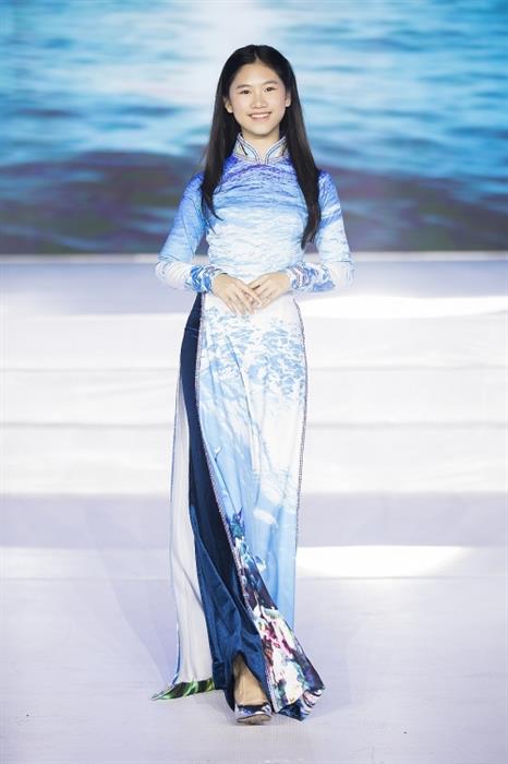 Con gái của Hoa hậu Paris Vũ - bé Hồng Uyên (13 tuổi) cũng tham gia trình diễn một thiết kế áo dài sắc xanh biển cả nền nã và duyên dáng.