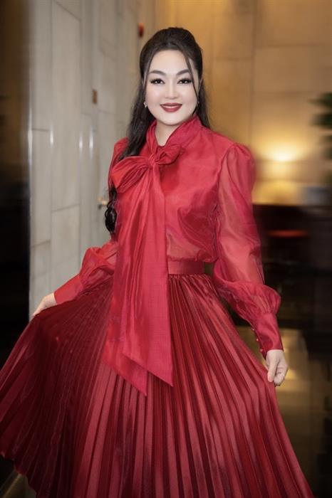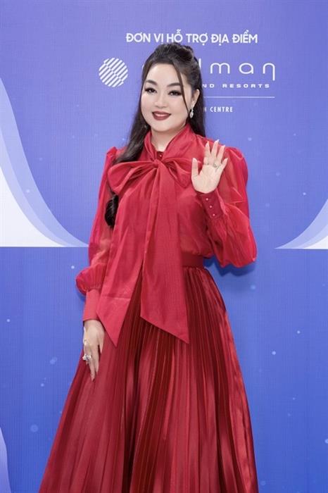 Hoa hậu Thanh Nga nổi bật trong chiếc váy xếp ly và chiếc áo có phần nơ to bản tông màu đỏ. Người đẹp chọn kết hợp với tone trang điểm nhẹ nhàng, sang trọng. Và không thể thiếu vắng những bộ trang sức kim cương đắt giá.