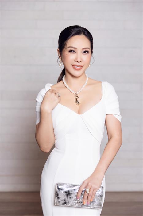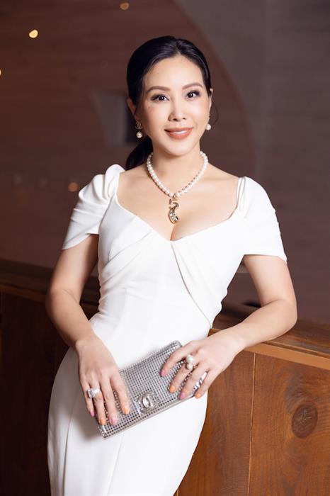 Đến chung vui cùng NTK Lê Thanh Hòa, Doanh nhân – Hoa hậu Thu Hoài diện đầm đuôi cá màu trắng cổ điển, với điểm nhấn là thiết kế cổ chữ V khoét sâu và phần tay áo xếp nếp khéo léo. Cô lựa chọn phụ kiện đi kèm gồm vòng cổ, nhẫn, hoa tai ngọc trai và clutch cầm tay màu bạc.