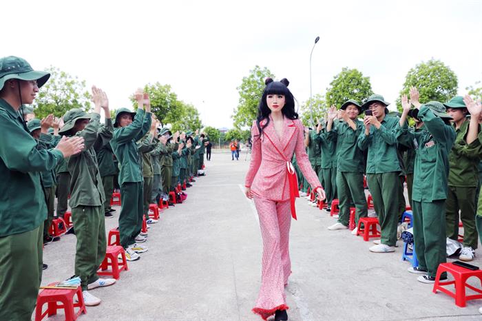 Khoác lên mình bộ vest đỏ trắng nổi bật cách tân sành điệu của nhà thiết kế Việt Nam Lê Thanh Hòa cùng kiểu tóc spacebuns đáng yêu được giới trẻ Mỹ yêu thích, cô tư tin thực hiện những sải bước catwalk chuyên nghiệp trước hàng nghìn sinh viên FPT tại Xuân Hòa, những người “chiến sĩ” đang khoác trên mình màu áo xanh đặc trưng của bộ đồ quân phục. Vào buổi chiều, cô lại một lần nữa gây ấn tượng mạnh với bộ váy đen trắng siêu cute từ hãng thời trang Việt Lane JT với sự cố vấn hình ảnh của John Kim và KMS.