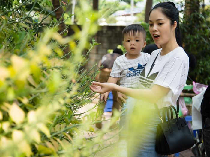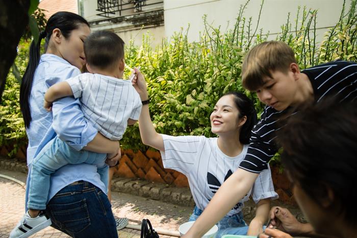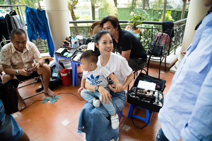 Xuất hiện tại phim trường, hai mẹ con Dương Cẩm Lynh và bé Will diện trang phục thể thao với chiếc áo thun sọc hiệu adidas và đôi giày thể thao năng động.