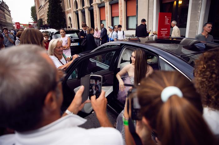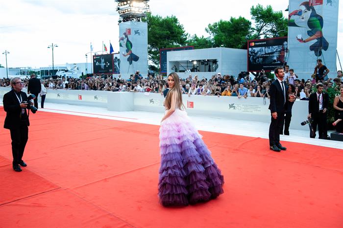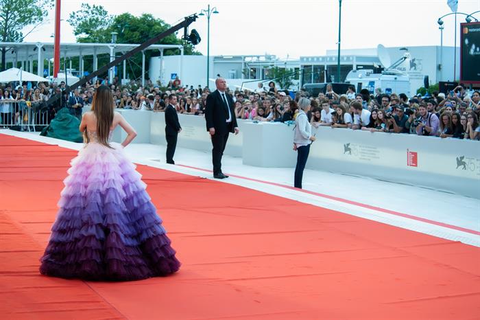 Vừa có chuyến công du thành công đầu tiên sang Rumani đã phải sắp xếp lịch trình bay sang Ý cùng ê-kíp để ủng hộ 'gà cưng' tranh giải Sư tử vàng, Lý Nhã Kỳ vẫn vô cùng rạng rỡ trong trang phục lộng lẫy của nhà thiết kế Đỗ Long, thu hút mọi ống kính của các nhiếp ảnh gia quốc tế.