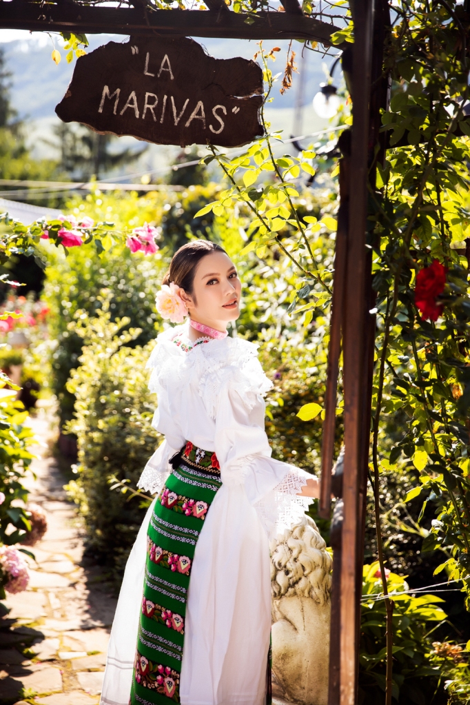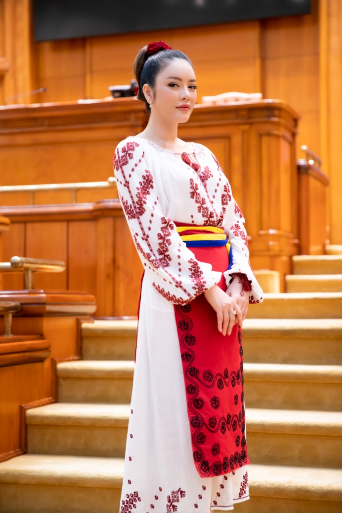 Diện trang phục truyền thống Romania được đo ni đóng giày, Lý Nhã Kỳ khoe vẻ đẹp truyền thống xen lẫn hiện đại. Với tông màu trắng chủ đạo kết hợp với nhiều họa tiết đặc trưng từ quốc gia châu Âu đã giúp nữ diễn viên Gió nghịch mùa thêm phần rạng rỡ. Người đẹp lựa chọn kiểu tóc búi cao kèm theo vài phụ kiện đơn giản như vòng hoa để tôn lên vẻ đẹp của bộ trang phục. Chính loạt thiết kế này đã giúp người đẹp tạo được thiện cảm đối với những lãnh đạo cấp cao tại Romania.