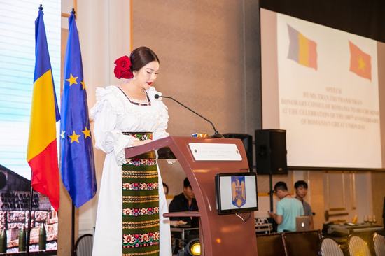 Trong trang phục truyền thống của Romania, bà Trần Thị Thanh Nhàn phát biểu tại lễ kỷ niệm, bày tỏ vui mừng được đóng góp sức mình vào việc thúc đẩy quan hệ hợp tác giữa hai nước.