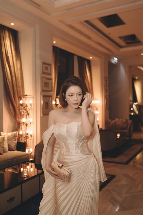 Diễn viên Kiều nữ và đại gia chọn chiếc váy được thực hiện cầu kỳ, với chi tiết chiết eo giúp tôn lên đường cong nóng bỏng. Phần chân váy được sử dụng kỹ thuật xếp ly, tạo hiệu ứng khi di chuyển. Người đẹp cho thấy sự biến hóa của mình trong phong cách thời trang. Khi đến một sự kiện không phải thuộc lĩnh vực giải trí, cô ưu tiên chọn thiết kế thanh lịch nhưng vẫn khéo léo khoe vóc dáng thon thả.