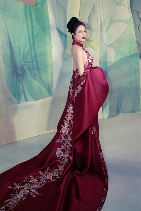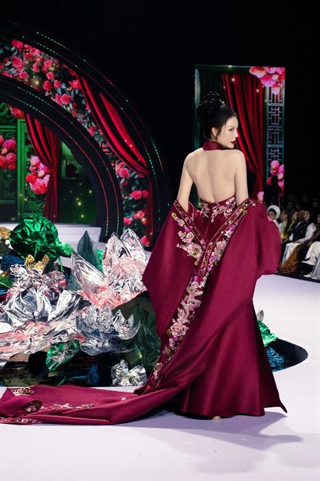 Chỉ trong một thời gian ngắn, chiếc váy hồng ngọt ngào đã được thay thế bằng bộ áo dài cách tân với chi tiết cổ yếm tinh tế – một biểu tượng của sự quyến rũ kín đáo trong văn hóa Việt Nam. Chiếc áo dài cổ yếm đỏ thắm đã phát huy tối đa lợi thế hình thể của cô, khoe khéo bờ vai thon thả và tấm lưng ngọc ngà, nhưng vẫn giữ được sự cao sang, đài các cần thiết cho một sàn diễn thời trang cao cấp.