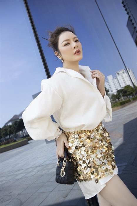 Cô diện áo sơ mi cách điệu, váy vàng của NTK Lê Thanh Hoà được đính kết bắt mắt phối cùng túi xách hàng hiệu. Để tổng thể thêm chỉn chu, Lý Nhã Kỳ chọn kiểu tóc búi cao tôn gương mặt thanh tú, phối phụ kiện của Louis Vuitton, Dior sang trọng.
