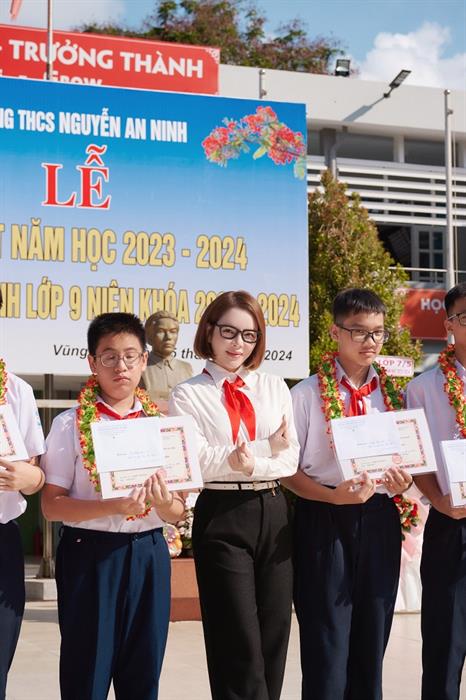 Người đẹp Lý Nhã Kỳ về thăm trường THCS Nguyễn An Ninh – Vũng Tàu, mái trường cấp 2 của mình vào trao tặng nhiều suất học bổng.