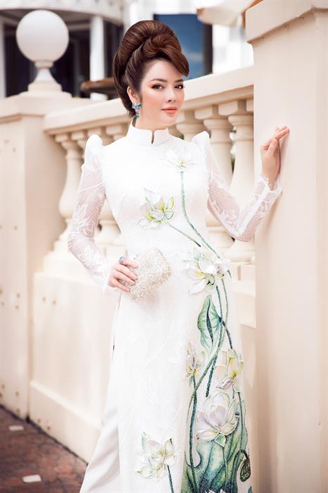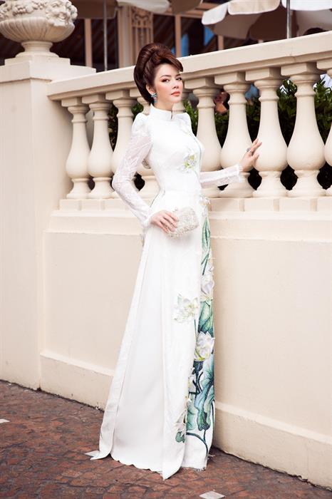 Xuất hiện với tà áo dài truyền thống thêu hoa sen nổi 3D, một thiết kế đẹp nền nã và không kém phần quý phái của NTK Đinh Văn Thơ, Lý Nhã Kỳ tiếp tục gửi gắm những gì đẹp nhất của quê hương Việt Nam đến bạn bè quốc tế.