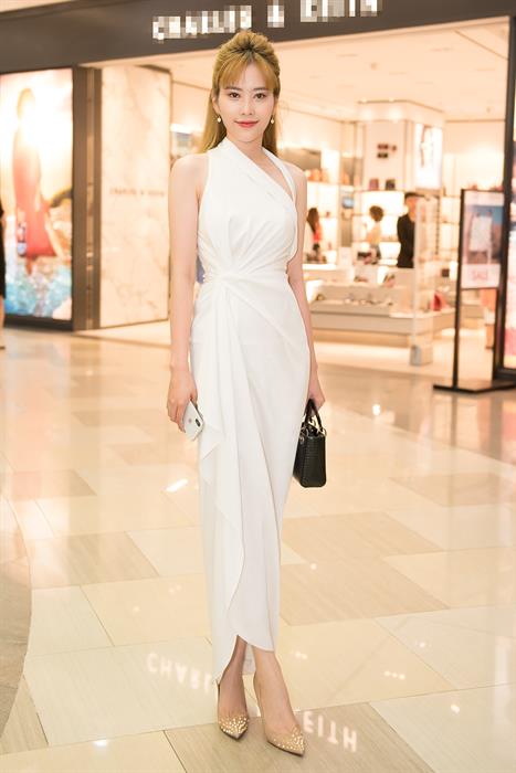 Diện 1 bộ váy trắng với điểm xuyến nhẹ nhàng tại eo, Nam Em còn khéo léo khi đôi chân dài miên man. Chọn tone trang điểm nhẹ nhàng đi cùng phụ kiện ton-sur-ton với bộ váy trắng. Không chỉ thay đổi ngoại hình, người đẹp còn thay đổi cả mái tóc đen bấy lâu nay.