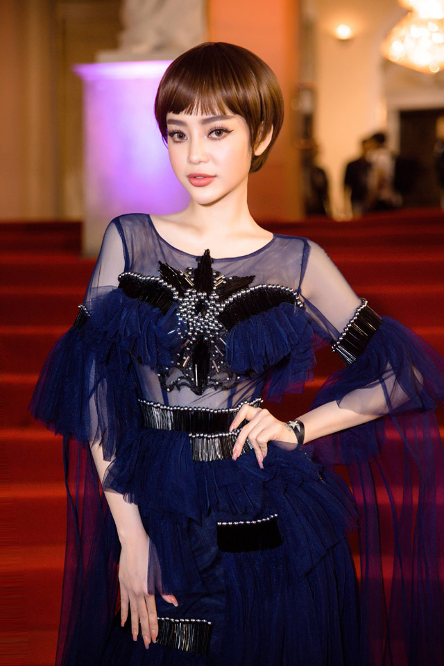 Xuất hiện tại sự kiện, Ngọc Ny khác lạ với tóc tém cá tính cùng đầm dạ hội cầu kỳ. Thiết kế của Leo Đình Bảo với ý tưởng rất phá cách, được đính kết bằng tay công phu, kết hạt cườm thành từng mảng khối ở phần ngực, eo, cánh tay… tạo sự quyến rũ thu hút cũng nhưng cũng đầy mạnh mẽ, nữ quyền. Đầm tone màu xanh mực điểm xuyến hạt kết màu đen làm điểm nhấn tôn làn da trắng sứ của Ngọc Ny The Voice.