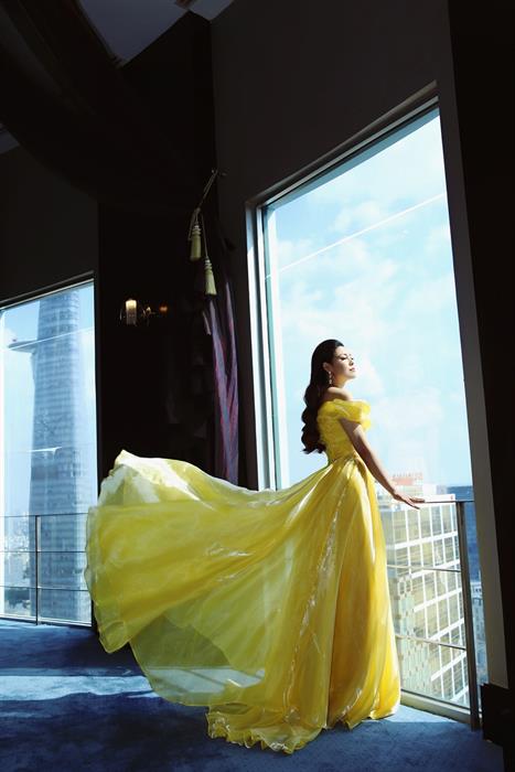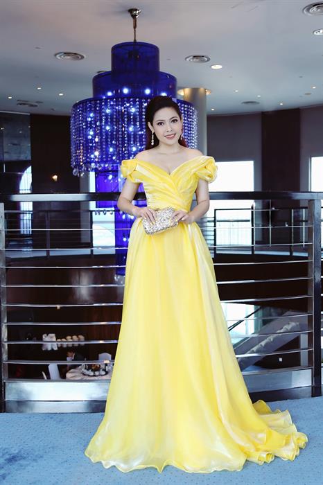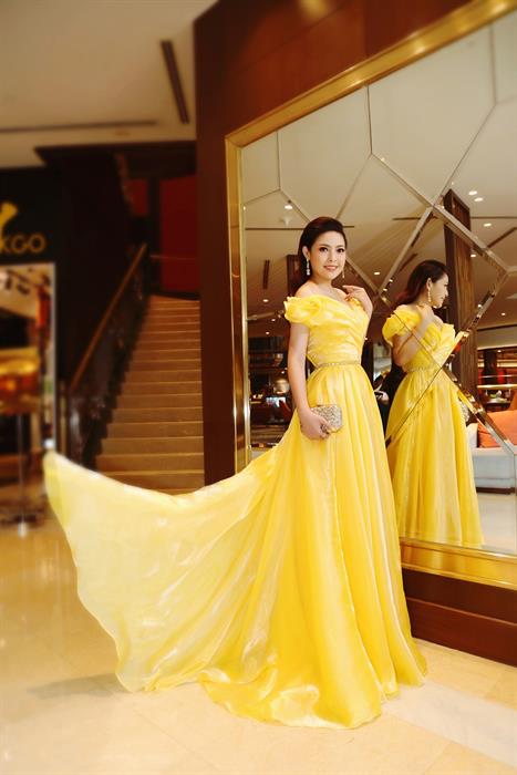 Tham dự sự kiện của Hoa hậu Mỹ Liên Hương, Kim Thanh Thảo chọn cho mình thiết kế dạ hội vàng rực mềm mại và sang trọng. Thiết kế của Nguyễn Minh Tuấn có điểm nhấn là phần vai trễ rập sóng phồng tăng sự duyên dáng và quyến rũ. Kim Thanh Thảo chọn kiểu tóc vuốt về sau gọn gàng cùng khuyên tai dài tôn nét mặt thành tú.