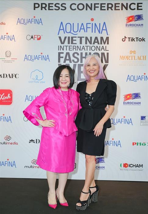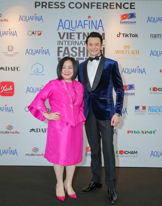 Xuất hiện đầu tiên trên thảm đỏ họp báo là Siêu mẫu Thanh Hằng, cô lựa chọn bộ trang phục nguyên cây đen gợi cảm nhưng không kém phần cá tính và quyền lực cùng Madam Trang Lê – Chủ tịch Hiệp hội các Nhà thiết kế thời trang Đông Nam Á, Người sáng lập đồng thời là Chủ tịch Tuần lễ Thời trang Quốc tế Việt Nam tại buổi Họp báo Aquafina Vietnam International Fashion Week 2021.