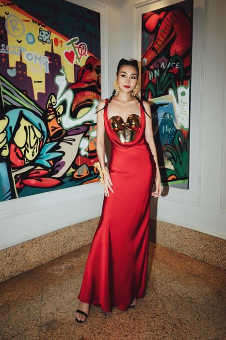 Tại sự kiện, Thanh Hằng trông cá tính khi diện bộ váy của thương hiệu CEM (Lê Minh Ngọc) kết hợp corset của Van Anh Scarlet by Đỗ Vân Trí, và phụ kiện từ Trần Quốc Dũng.